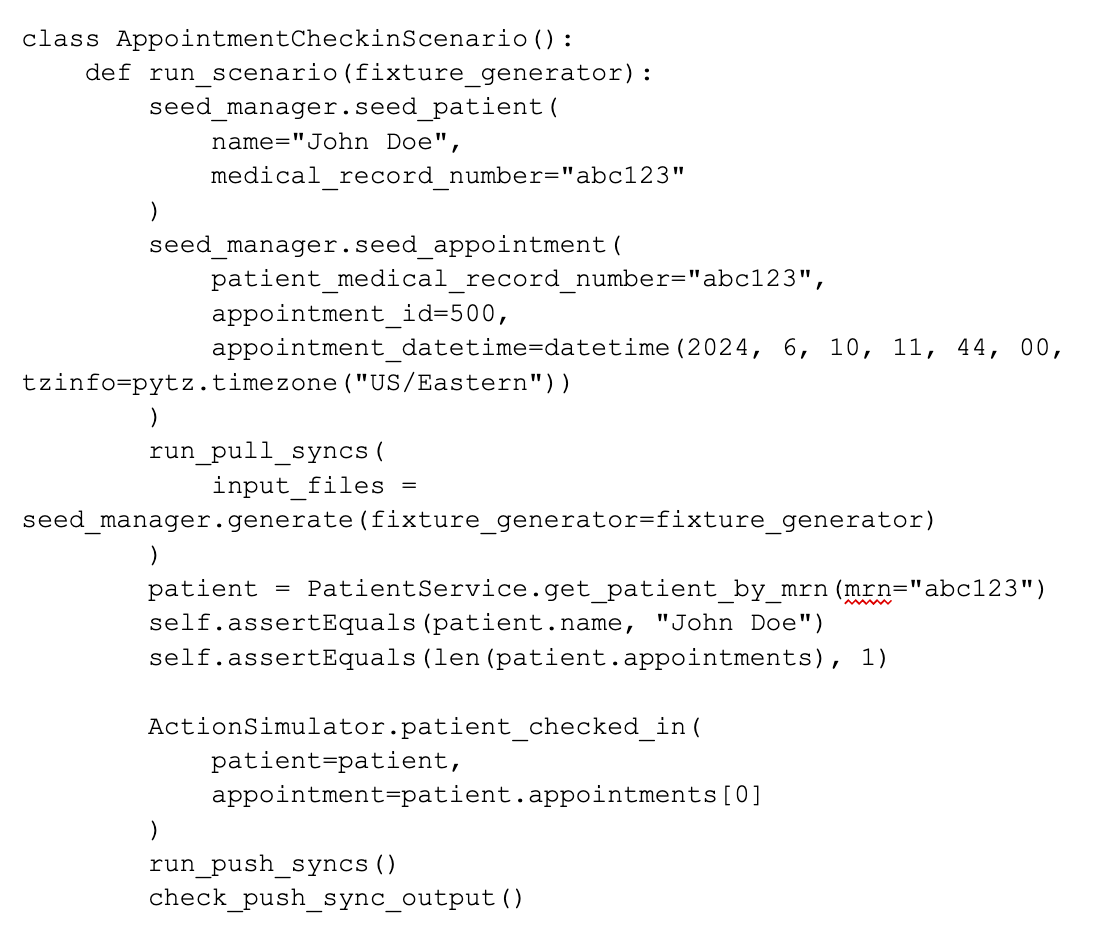- The simpler structure of the scenario allows us to more easily model complex workflows, such as pull syncs, followed by patient actions, followed by push syncs, followed by more pull and push syncs. We can even compose scenarios to model more complex workflows, while keeping the scenarios themselves readable and maintainable.