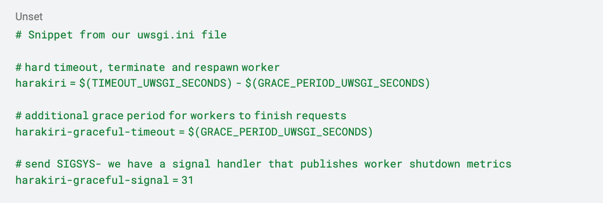 There was also the risk of many harakiri events occurring within a short period of time, which would diminish the application’s capacity to respond to requests. It takes about 10 seconds for uWSGI to replace the terminated worker in our case, and we had concerns that this waiting period could result in a backlog of inbound requests.