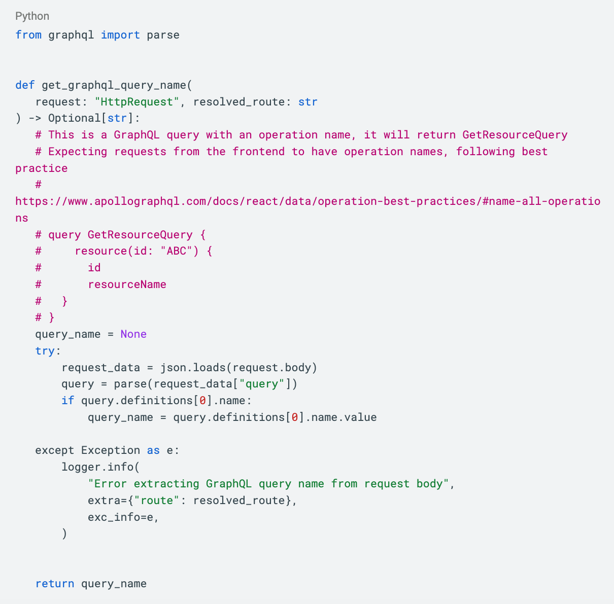 First, all of our GraphQL requests use a common url path, while the body of the request is what contains the actual GraphQL query or mutation being requested. So we only had a single response time metric for all our GraphQL requests and couldn’t identify the problematic operations. To fix this, we modified our middleware to inspect the body of GraphQL requests, and tag the response time metrics it created with the GraphQL operation being requested.